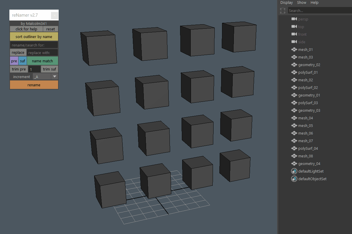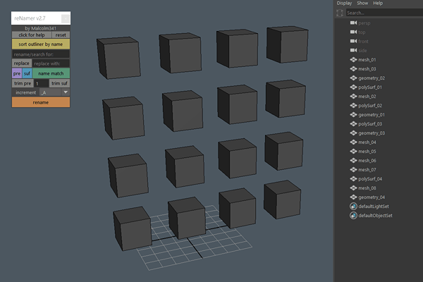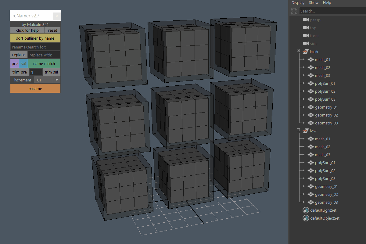 The pre button appends the characters in the upper text field to the beginning of the object name. The suf button appends the characters in the upper text field to the end of the object name. The name match button inserts the word _high or _low before the increment if the mesh is inside a group named high or low. This is helpful for renaming multiple meshes in one click if you're going to use the name matching feature of Marmoset Toolbag, Substance Painter, or another baking program. Create a group named high and a group named low using all lowercase letters. Put your high and low meshes into the corresponding groups, make sure the hierarchical order of the meshes is the same in both groups so the numbered increment corresponds to the correct mesh in each group. Type a base name into the upper text field if you want to rename all the meshes to the same name, this can save time if you don't care about names because everything will be name matched in the baking program. If you want to keep existing names, leave the upper text field blank and the name match button will keep your existing names up until the first underscore and replace everything after the first underscore with _high or _low and the increment. Hold Ctrl and click the first mesh inside the high group, then hold Shift and click the last mesh inside the high group to select everything, but the group. Do the same for the meshes in the low group, make sure your selection order is the same between both groups so the increment gets added correctly. Press the name match button. Meshes will be renamed to: