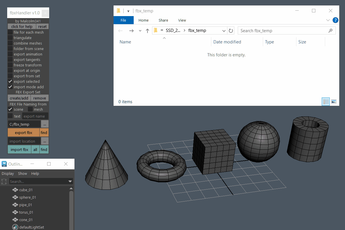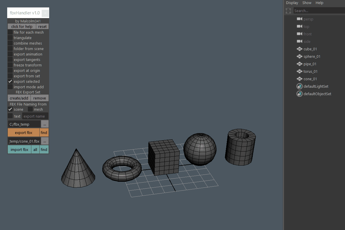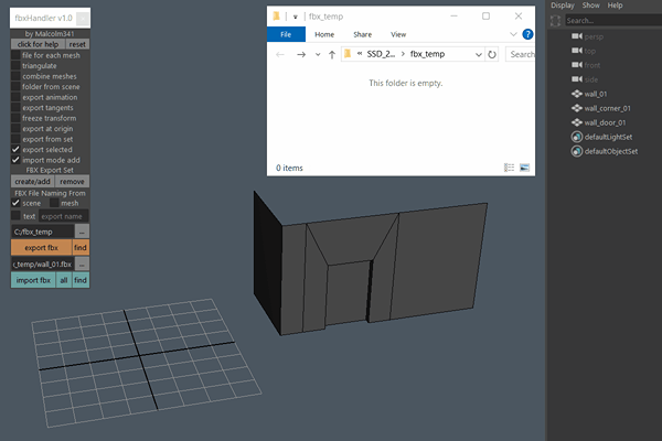 The create/add button creates and adds selected objects to the fbxHandler_Export_Set in the Outliner. The remove button removes selected objects from the fbxHandler_Export_Set. If the export from set checkbox is turned on only objects found in the fbxHandler_Export_Set get exported when you press the export fbx button. This is helpful so you don't have to select meshes each time you want to export, but also because you can include work in progress meshes and other objects in the scene and still export a clean file for Unreal or Unity.