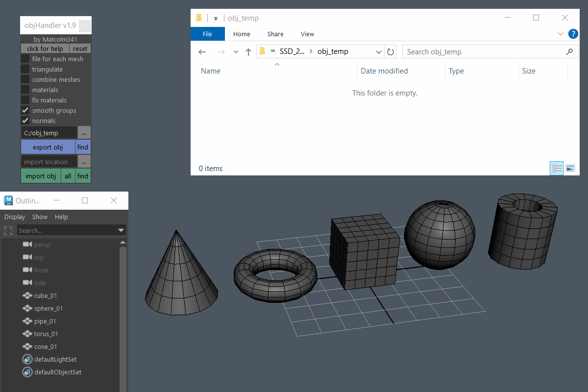 Speeds up exporting meshes as .obj for use with applications like Zbrush. Export each mesh as a separate file, triangulate, import multiple, custom file location, and more.
