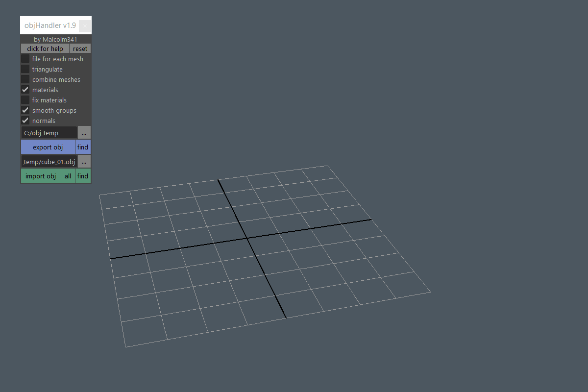 The export obj button exports selected objects as .obj to the folder specified in the export location field. The find button opens the folder specified in the export location field.